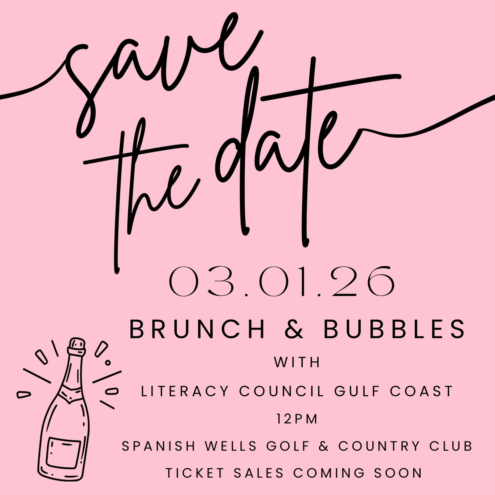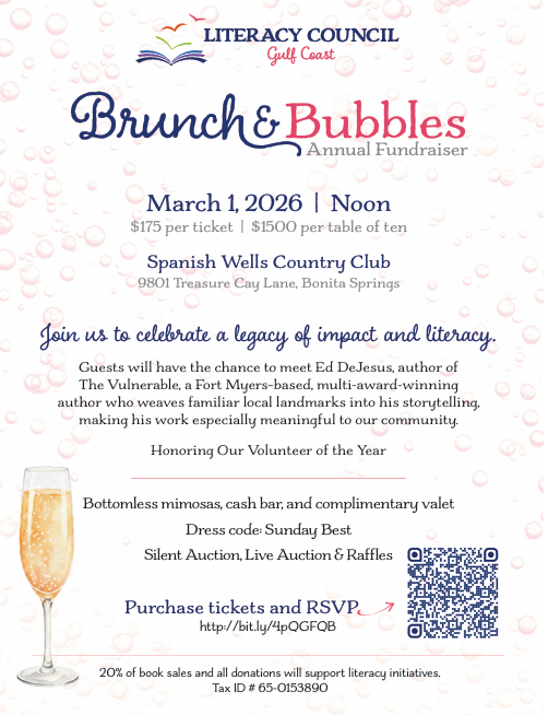 Join us for Brunch & Bubbles, the Literacy Council Gulf Coast’s annual fundraiser, on March 1st, 2026 at noon at Spanish Wells Country Club in Bonita Springs, as we celebrate a legacy of impact while honoring our dedicated tutors and students, enjoying bottomless mimosas, live and silent auctions, complimentary valet, a cash bar, and a special appearance by local award-winning author Ed DeJesus.